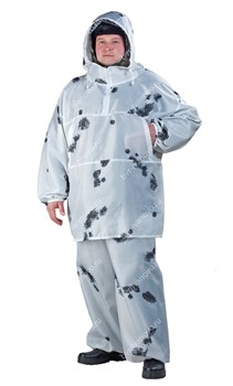 Маскировочный костюм "Клякса" состоит из куртки и брюк. Куртка с капюшоном, есть два боковых кармана. Рукав на резинке. Костюм предназначен для маскировки на заснеженной местности. Идеально подходит для охоты в зимнее время. Одевается на любой вид одежды и обеспечивают максимальную маскировку в лесу.
